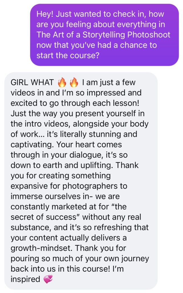 If you’re looking for a course that covers experience for your future clients and artistic storytelling, you can absolutely get this! If you’re looking to learn to shoot in manual and get the basics of a photography business, this course is probably not the best fit for you right now. Come back when you have your camera figured out, so we can get into all of the other fun stuff in storytelling!