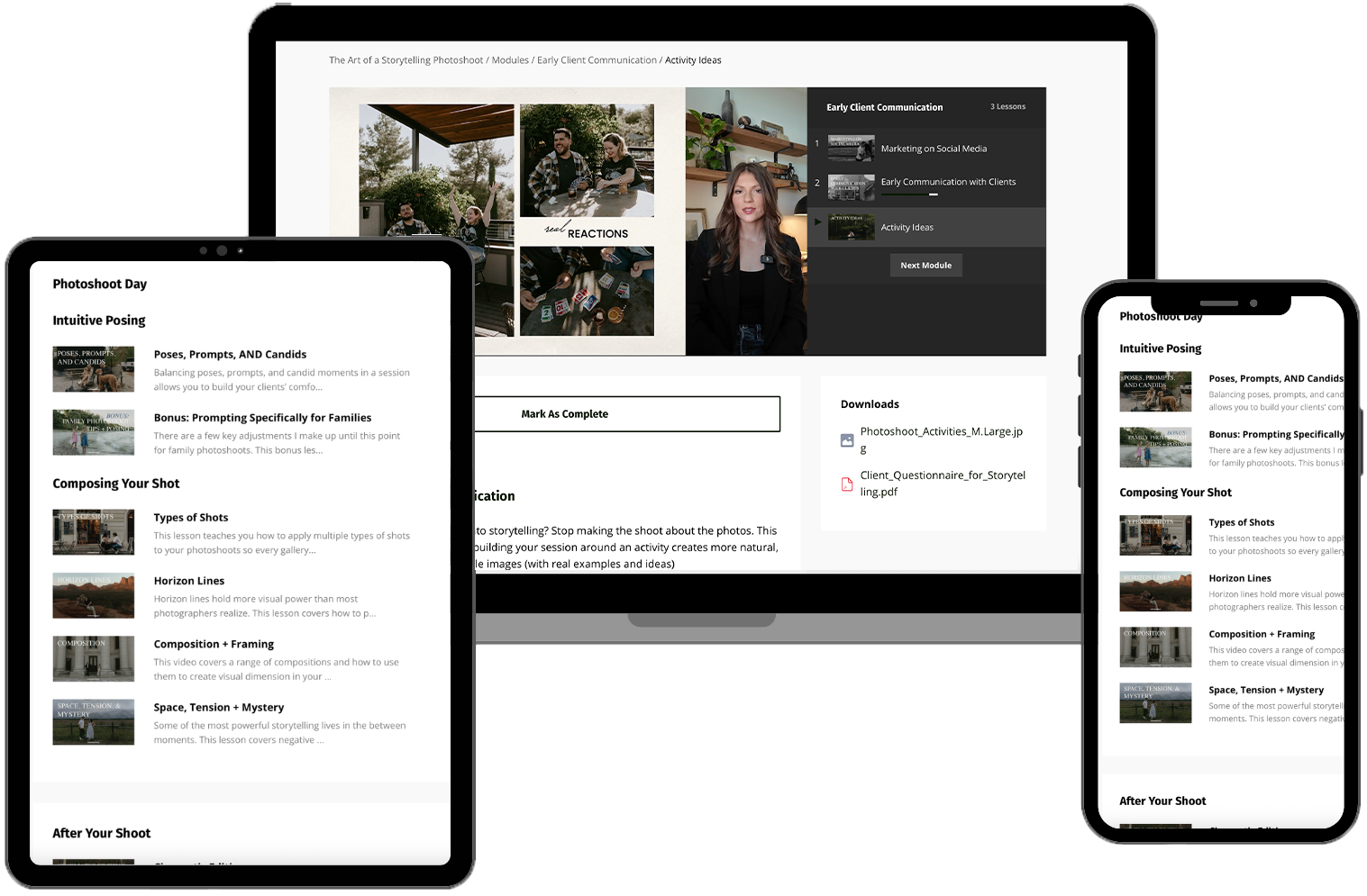 The course covers 22 lessons, each focused on a specific part of the photoshoot process. It goes from marketing and early client communication, through creative direction, planning logistics, shoot day, posing clients, composition, editing, and gallery delivery. It ends with live photoshoot walkthroughs so you can see everything in action. You can move through each lesson at your own pace, most photographers take 2-3 weeks to complete the course and revisit modules as they need.